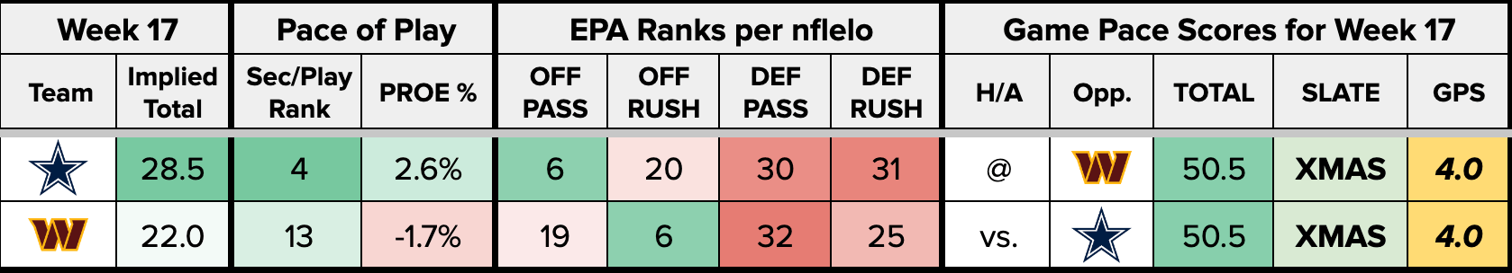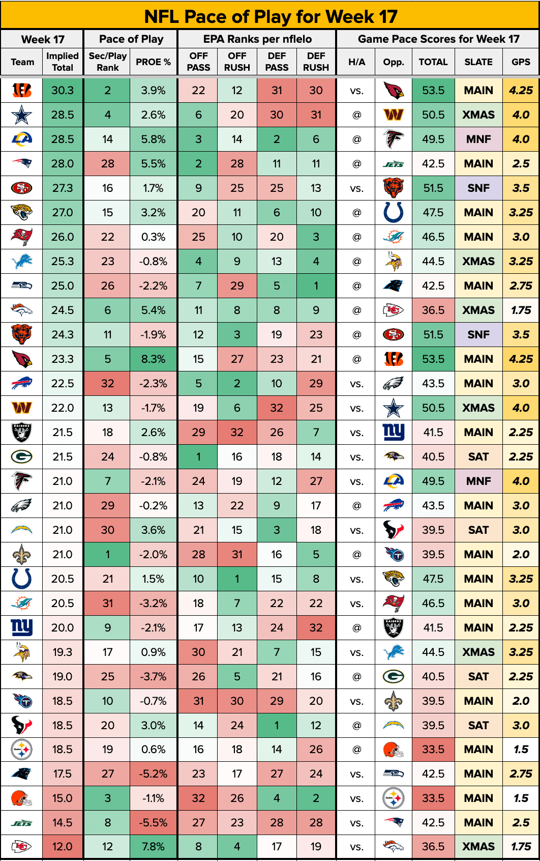 For Week 17, I’ve sorted by all 32 team implied totals while focusing on seconds per play and pass rate over expectation (PROE), and Expected Points Added per play (EPA) ranks.