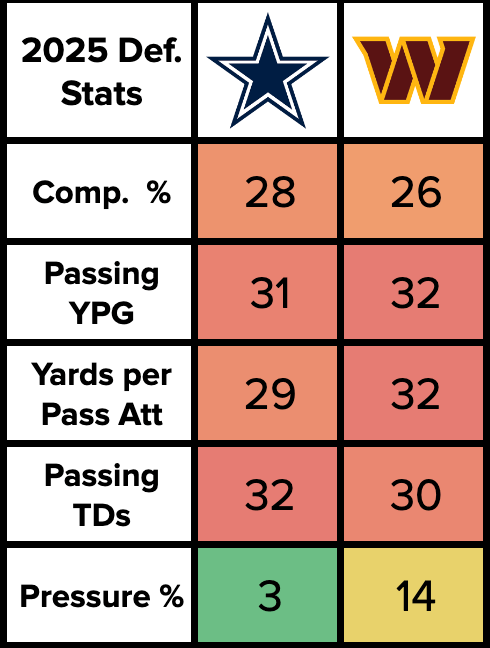 You know the story by now with Dallas games averaging 58.5 combined points per game this season. Both teams turn the ball over a ton (DAL- 29th in TO differential / WAS- 30th) but the real ticket is how bad the passing defenses are:
